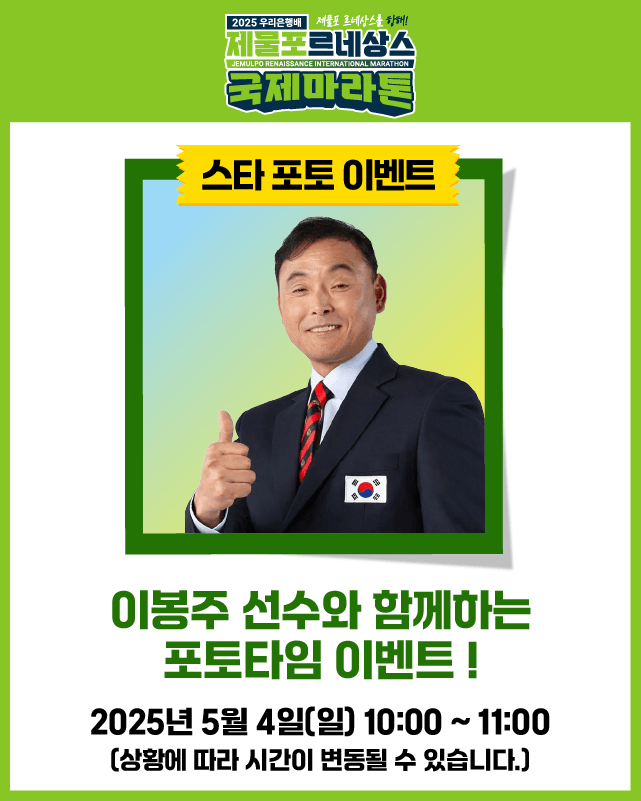 대회 당일, 이봉주 선수와 함께하는 포토타임 이벤트가 진행될 예정입니다.