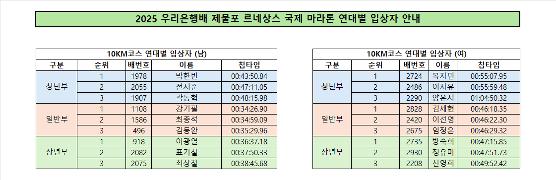 [연령별 입상자] 2025 우리은행배 제물포 르네상스 국제 마라톤 연령별 시상 입상자 안내