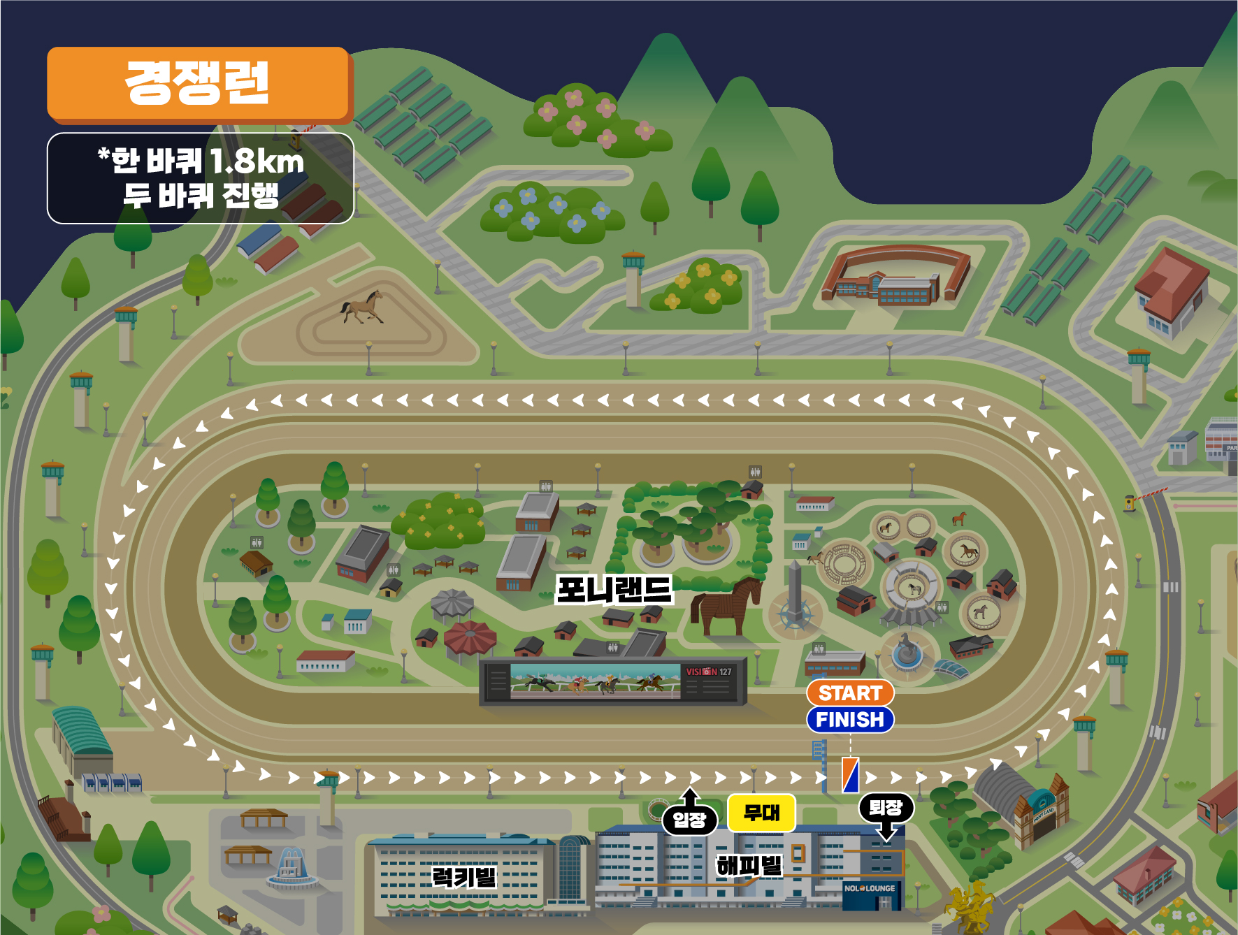 경주로 두 바퀴, 총 3.6km에서 기록과 순위를 겨루는 경쟁 레이스!